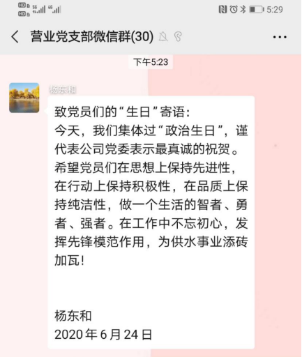 烏海市海勃灣城市供水有限公司為進一步增強主題教育的吸引力和感染力,于6月24日開展黨員“過政治生日,憶入黨初心”主題黨日活動。五個黨支部分別在完成奏唱國歌、重溫入黨誓詞、領(lǐng)誦黨章、繳納黨費、學(xué)習(xí)政治理論后為黨員過“政治生日”。