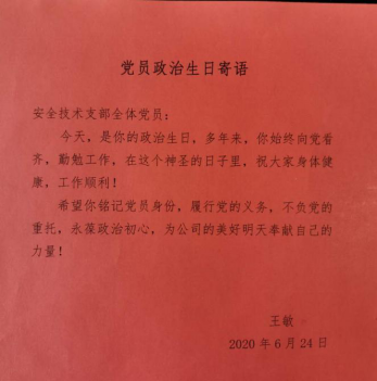 通過“過政治生日,憶入黨初心”活動,讓黨員常思“當初入黨為什么、如今在黨做什么、今后為黨留什么”,引導(dǎo)黨員自覺加強黨性鍛煉,優(yōu)化工作作風(fēng),發(fā)揮模范作用,切實增強黨支部的向心力、凝聚力、戰(zhàn)斗力。