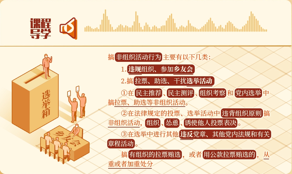 黨內(nèi)選舉是黨內(nèi)政治生活的重要組成部分?!蛾P(guān)于新形勢下黨內(nèi)政治生活的若干準(zhǔn)則》規(guī)定,黨內(nèi)選舉必須體現(xiàn)選舉人意志,堅(jiān)決防止和查處拉票賄選等行為。在選舉活動中搞非組織活動,干擾選舉人表達(dá)選舉意愿,侵犯其他被選舉人權(quán)益,侵蝕黨內(nèi)政治文化,在黨員群眾中造成不良影響,對這類違反組織紀(jì)律的行為必須予以堅(jiān)決懲治。