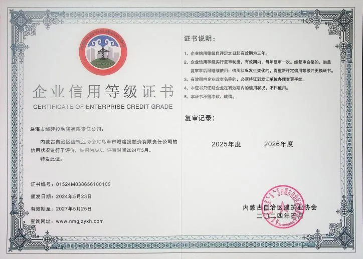 近日,經(jīng)內(nèi)蒙古自治區(qū)建筑業(yè)協(xié)會評選,烏海市城建投融資有限責(zé)任公司成功榮獲《2024年度內(nèi)蒙古自治區(qū)建筑業(yè)AAA級信用企業(yè)》稱號。此項殊榮的獲得,是對城建公司長期以來在建筑業(yè)領(lǐng)域誠信經(jīng)營、規(guī)范管理的充分肯定。