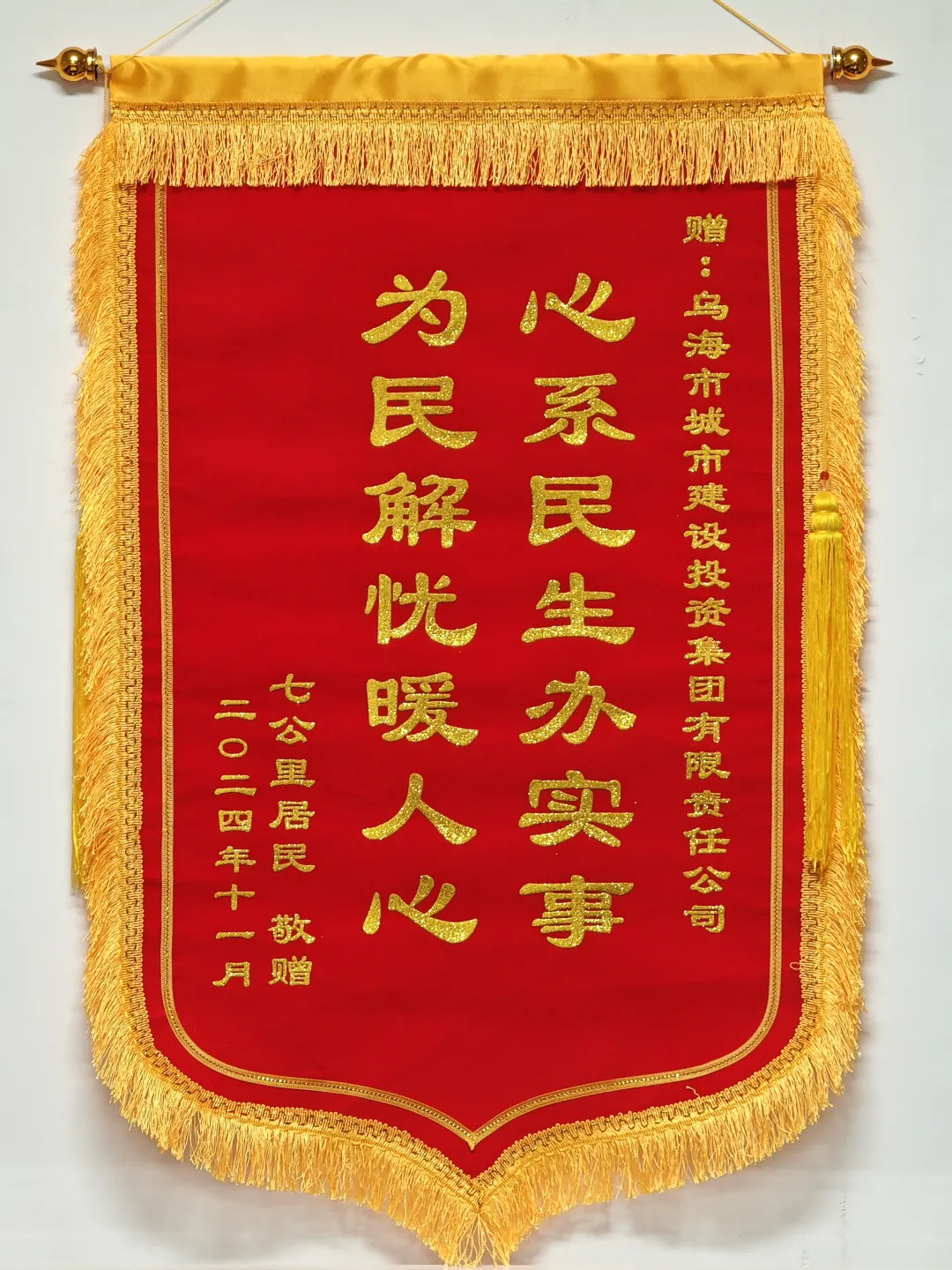 11月6日上午,烏海市城市建設(shè)投資集團有限責任公司收到海勃灣區(qū)三廠七公里處居民送來的錦旗,錦旗上的“心系民生辦實事 為民解憂暖人心”幾個大字熠熠生輝。