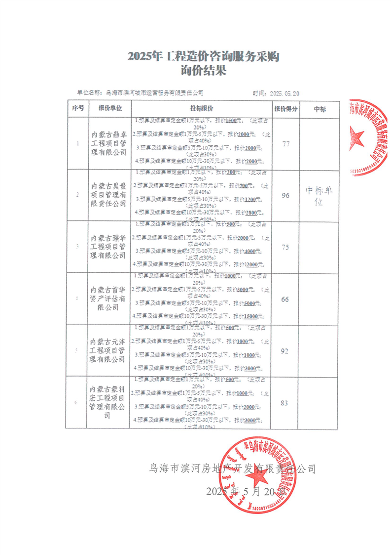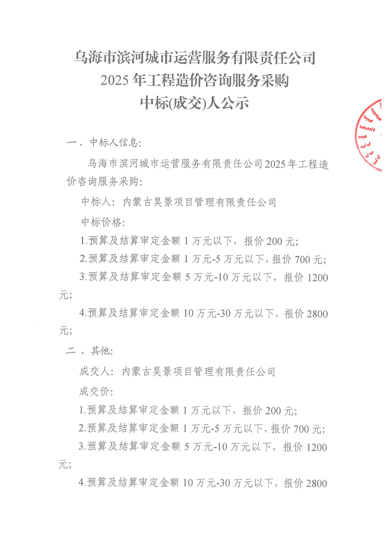 烏海市濱河城市運營服務(wù)有限責(zé)任公司2025年工程造價咨詢服務(wù)采購中標(biāo)(成交)人公示