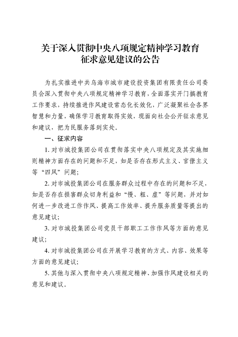 關(guān)于深入貫徹中央八項(xiàng)規(guī)定精神學(xué)習(xí)教育征求意見建議的公告
