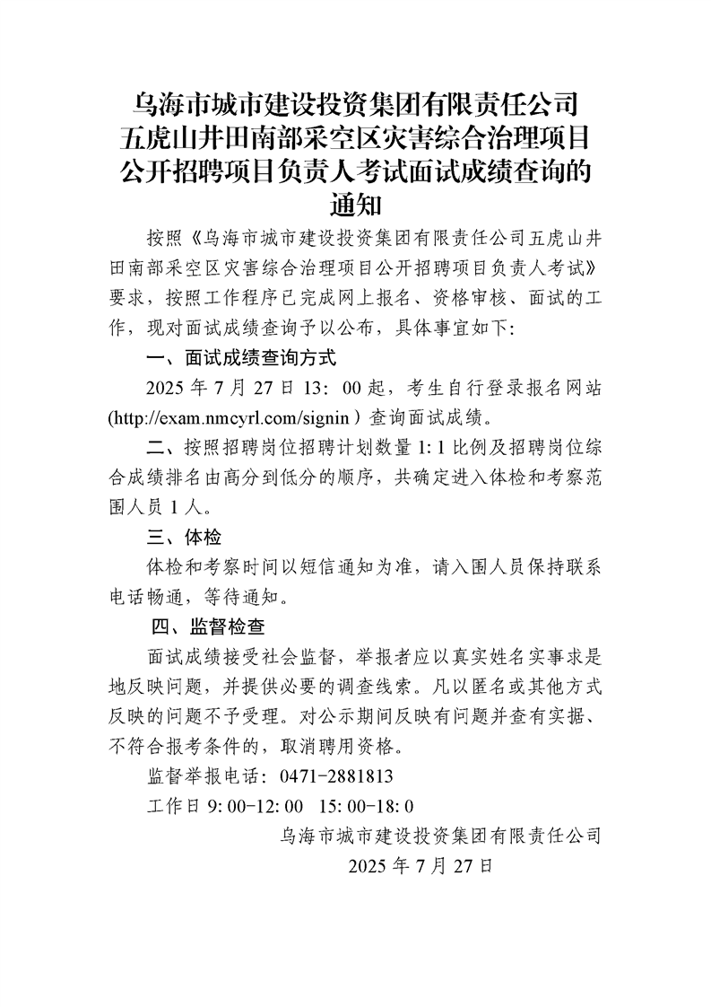 烏海市城市建設(shè)投資集團(tuán)有限責(zé)任公司五虎山井田南部采空區(qū)災(zāi)害綜合治理項(xiàng)目公開招聘項(xiàng)目負(fù)責(zé)人考試面試成績(jī)查詢的通知