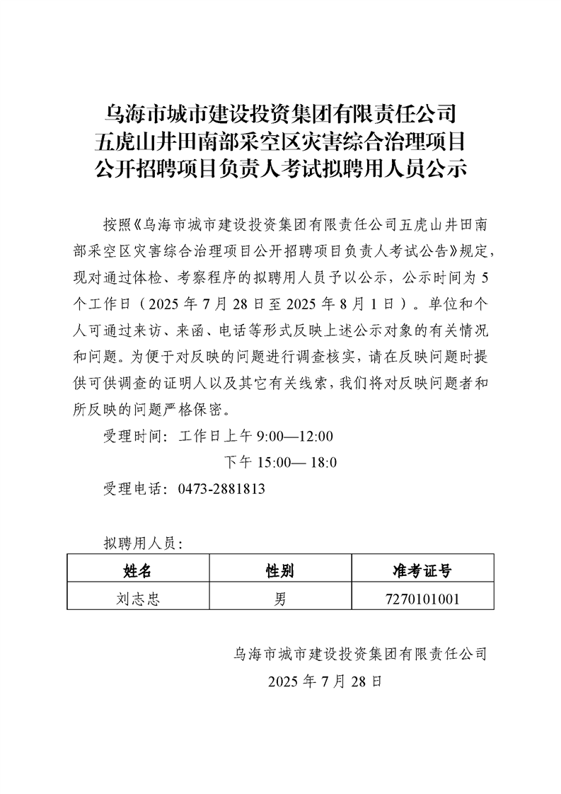 烏海市城市建設(shè)投資集團有限責(zé)任公司五虎山井田南部采空區(qū)災(zāi)害綜合治理項目公開招聘項目負責(zé)人考試擬聘用人員公示
